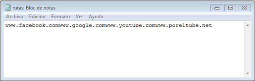 Abrirán el archivo www.belzusarri.com/rutas.txt (en realidad sera otra ruta) y en el pegaran una dirección web al final de la ultima linea y meterán un enter. La siguiente vez pegaran otra dirección web y meterán otro enter. Probablemente una de las lineas sera cambiada por otra dirección web y esta vez no meterán enter porque sino quedaría un espacio vacío entre una dirección y otra.